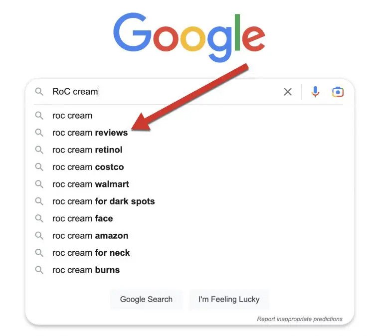 Type a product name in Google search, and you’ll likely see a review of that item as a top autocomplete suggestion. This example is for “RoC cream.” Click image to enlarge.